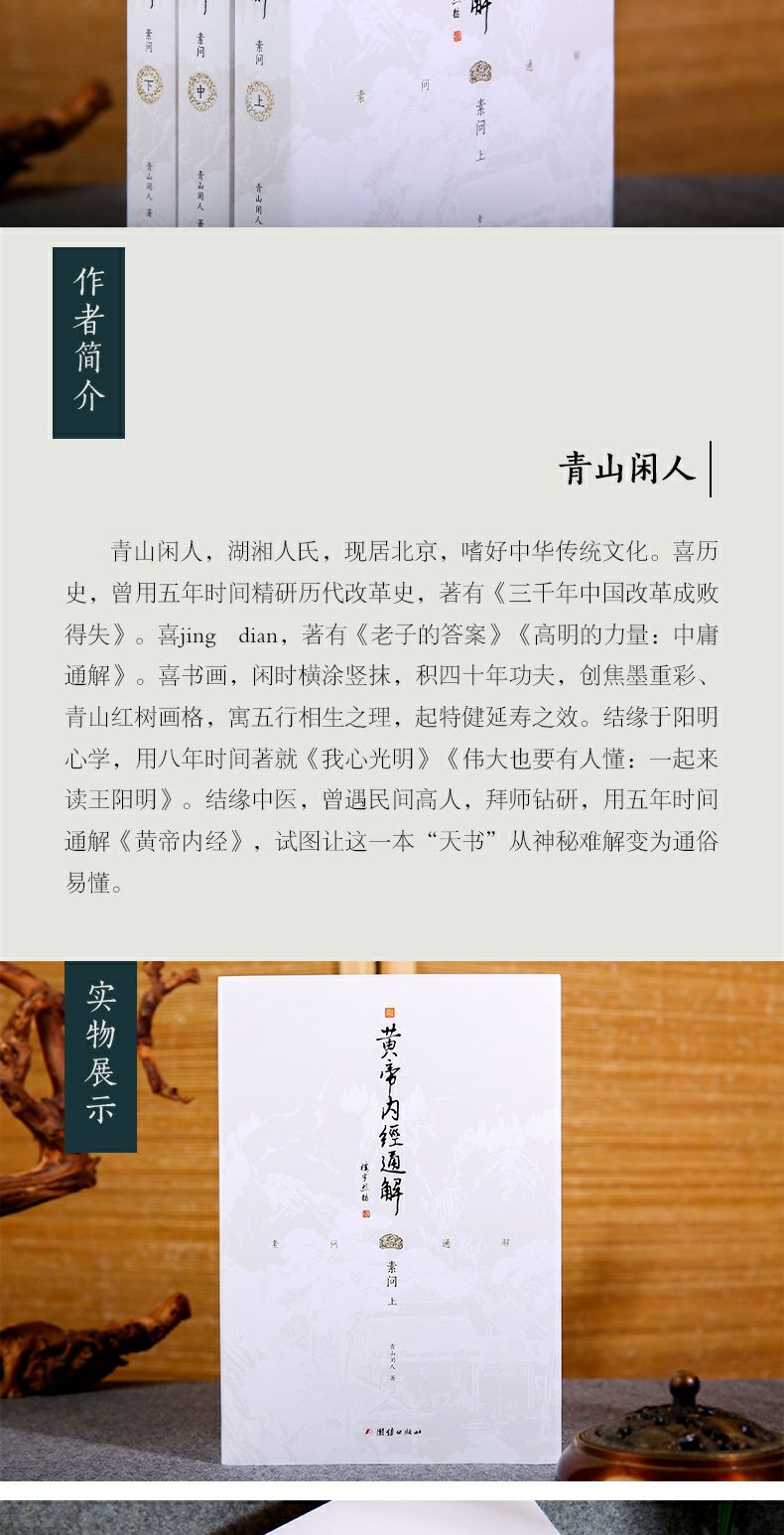 青山閒人,湖湘人氏,現居北京,嗜好中華傳統文化。喜歷史,著有《老子的答案《高明的力量:中庸通解》。喜書畫,閒時橫塗豎抹,積四十年功夫,創焦墨重彩、青山紅樹畫格,寓五行相生之理,起特健延壽之效。結緣於陽明心學,用八年時間著就《我心光明《偉大也要有人懂:一起來讀王陽明。結緣中醫,曾遇民間高人,拜師鑽研,用五年時間通解《黃帝內經,試圖讓這一本「天書」從神秘難解變為通俗易懂。