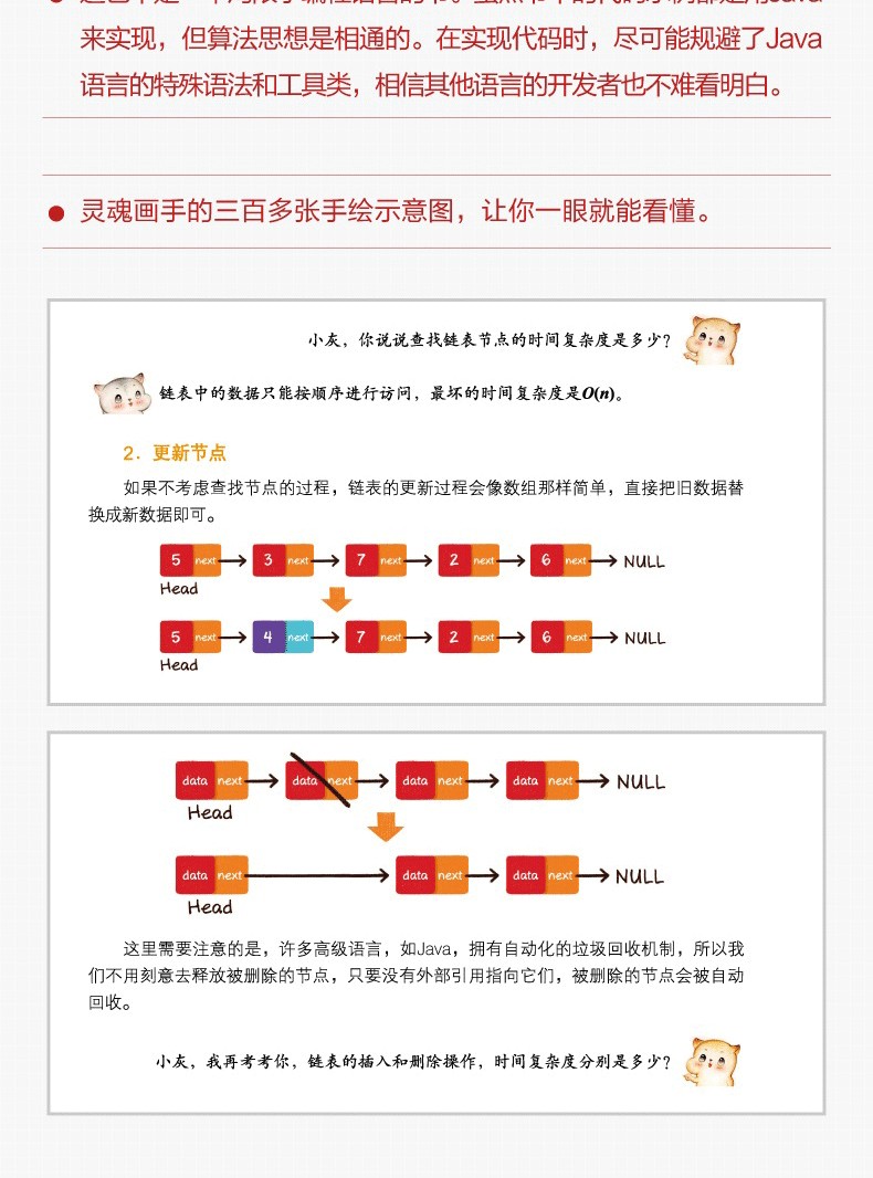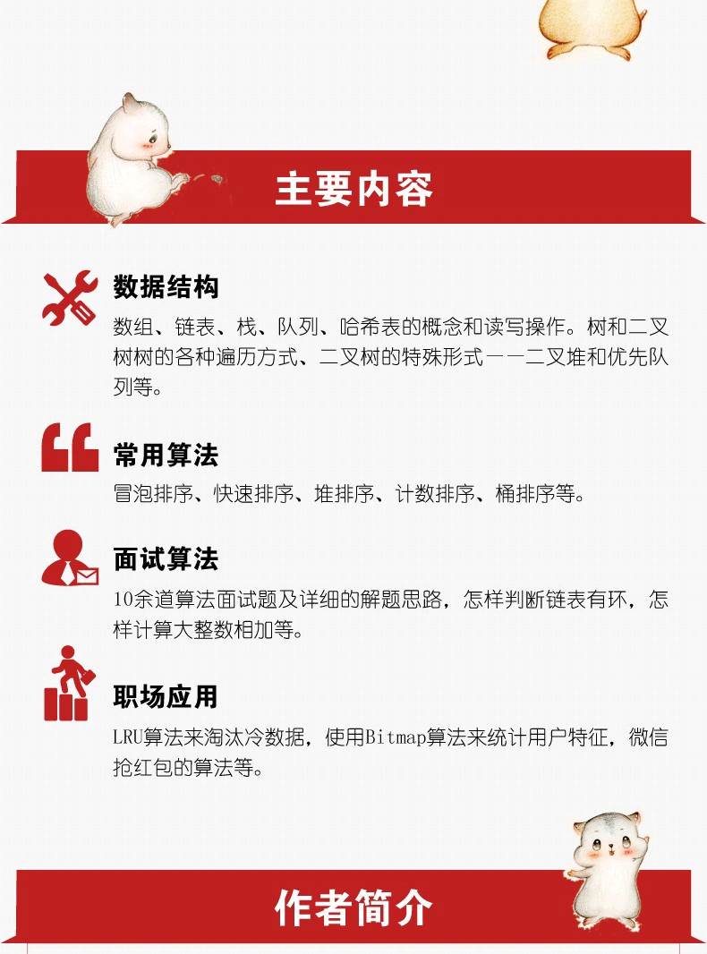 本書通過虛擬的主人公小灰的心路歷程,用漫畫的形式講述了算法和數據結構的基礎知識、複雜多變的算法面試題目及算法的實際應用場景。第1章 介紹了算法和數據結構的相關概念,告訴大家算法是什麼,數據結構又是什麼,它們有哪些用途,如何分析時間複雜度,如何分析空間複雜度。第2章 介紹了最基本的數據結構,包括數組、鍊錶、棧、隊列、哈希表的概念和讀寫操作。第3章 介紹了樹和二叉樹的概念、二叉樹的各種遍歷方式、二叉樹的特殊形式——二叉堆和優先隊列的應用。第4章 介紹了幾種典型的排序算法,包括冒泡排序、快速排序、堆排序、計數排序、桶排序。第5章 介紹了10餘道職場上流行的算法面試題及詳細的解題思路。例如怎樣判斷鍊表有環,怎樣計算大整數相加等。第6章 介紹了算法在職場上的一些應用,例如使用LRU算法來淘汰冷數據,使用Bitmap算法來統計用戶特徵等。
