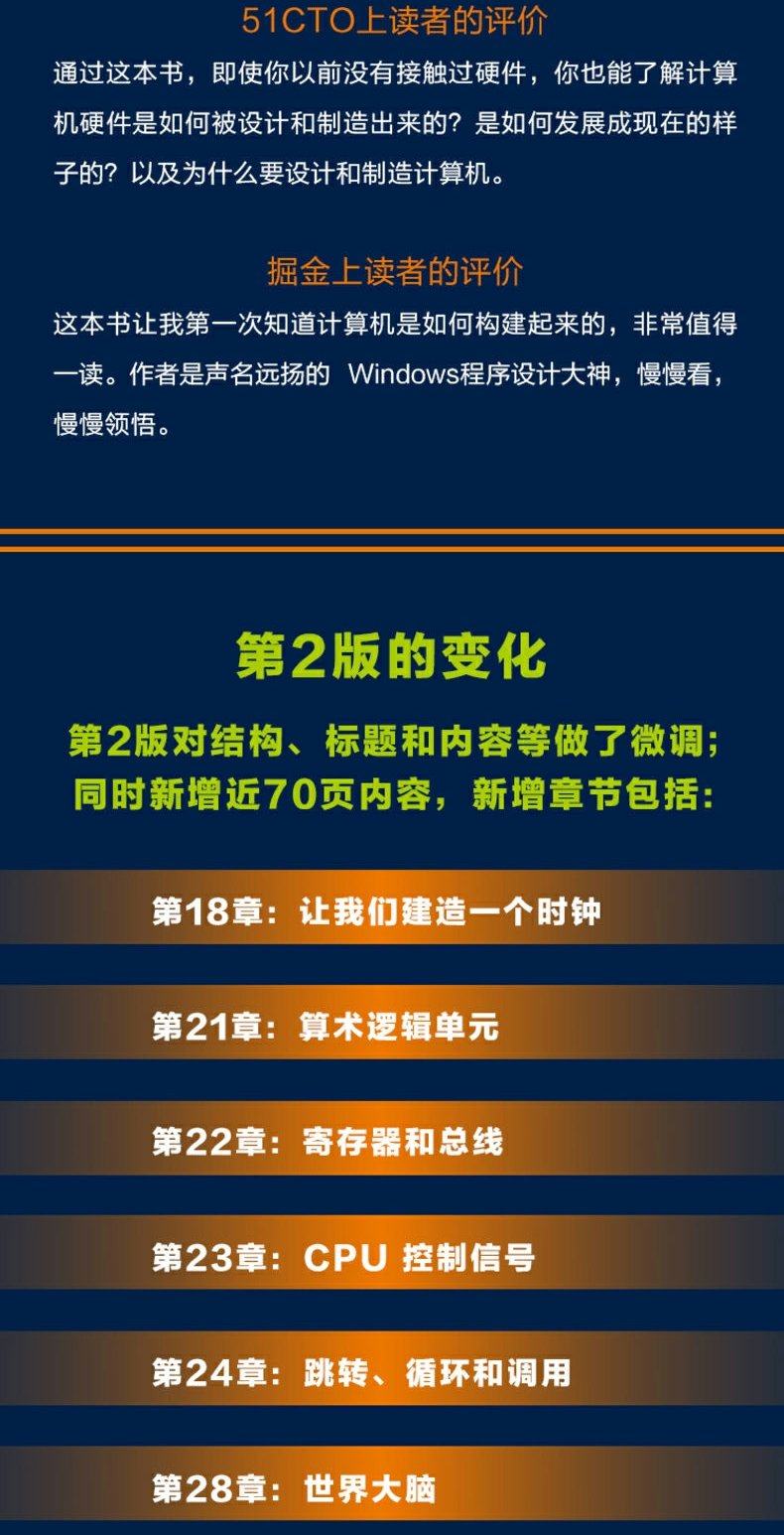 《編碼:隱藏在計算機軟硬體背後的語言》是一本講述計算機工作原理的書。不過,你千萬不要因為「運作原理」之類的字眼就武斷地認為,它是晦澀而難懂的。作者用豐富的想像力和清晰的筆墨將看似繁雜的理論闡述得通俗易懂,你絲毫不會感到枯燥和生硬。更重要的是,你會因此而獲得對計算機工作原理較深刻的理解。這種理解不是抽象層面上的,而是具有一定深度的,這種深度甚至不遜於「電氣工程師」和「程式設計師」的理解。