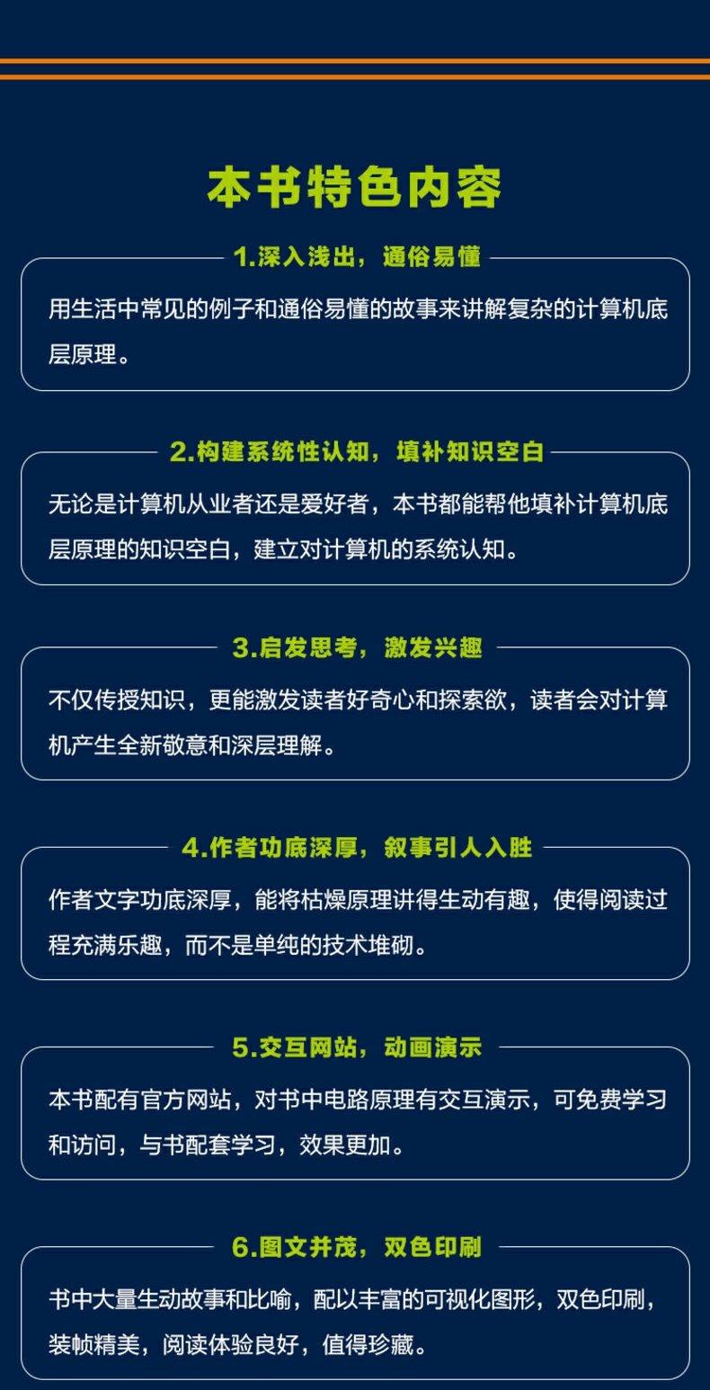 本書是一本深入淺出揭示電腦運作本質的經典著作。全書以「通訊」為核心線索,從手電筒的開關控制講起,透過燈泡的亮滅引入二進位概念,進而剖析莫爾斯電碼、布萊葉點字等編碼系統如何成為訊息傳遞的基石。隨後,作者以邏輯閘電路為起點,層層遞進地解釋如何透過繼電器、觸發器、記憶體等元件搭建具備運算能力的機器,最終演化為現代電腦的中央處理器(CPU)。書中也探討了作業系統、程式語言及軟體開發的底層邏輯,揭示了程式碼如何驅動硬體完成複雜任務。第2版新增了對現代電腦科技發展的延伸討論,例如,網路通訊原理、圖形介面實現機制等,使內容更貼合當下技術趨勢。