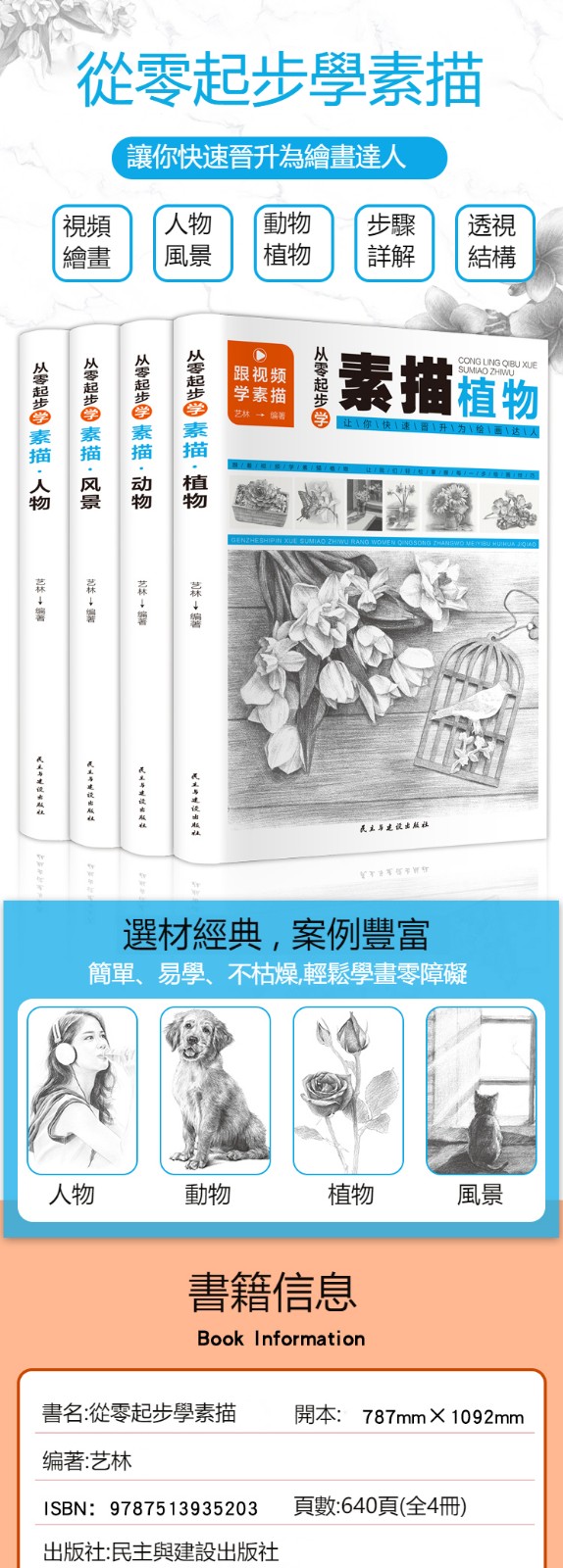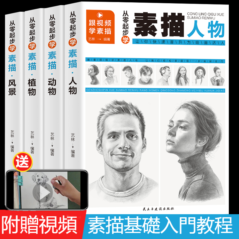 【全套4冊】从零起步学素描 零基础教程从入门到精通 植物动物风景人物素描速写