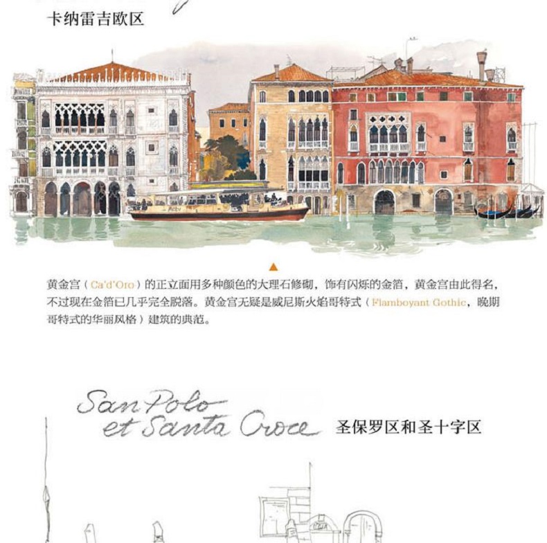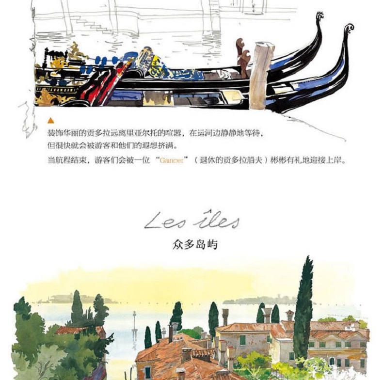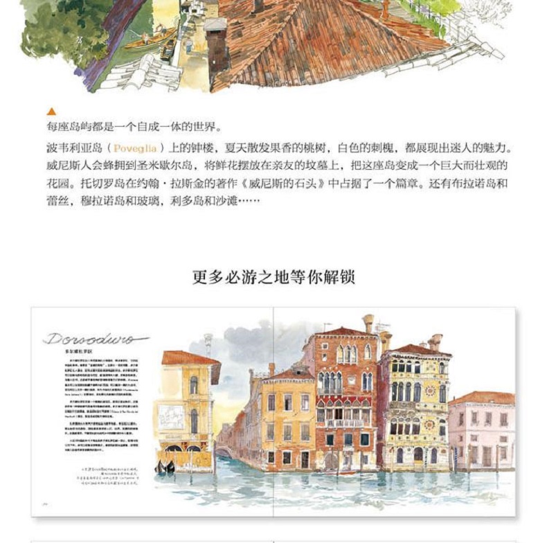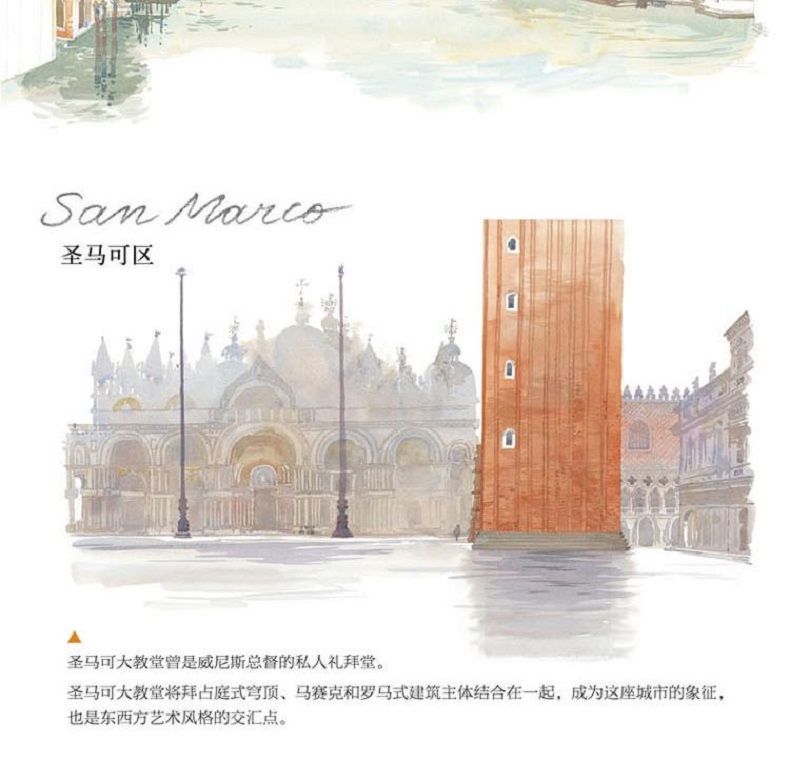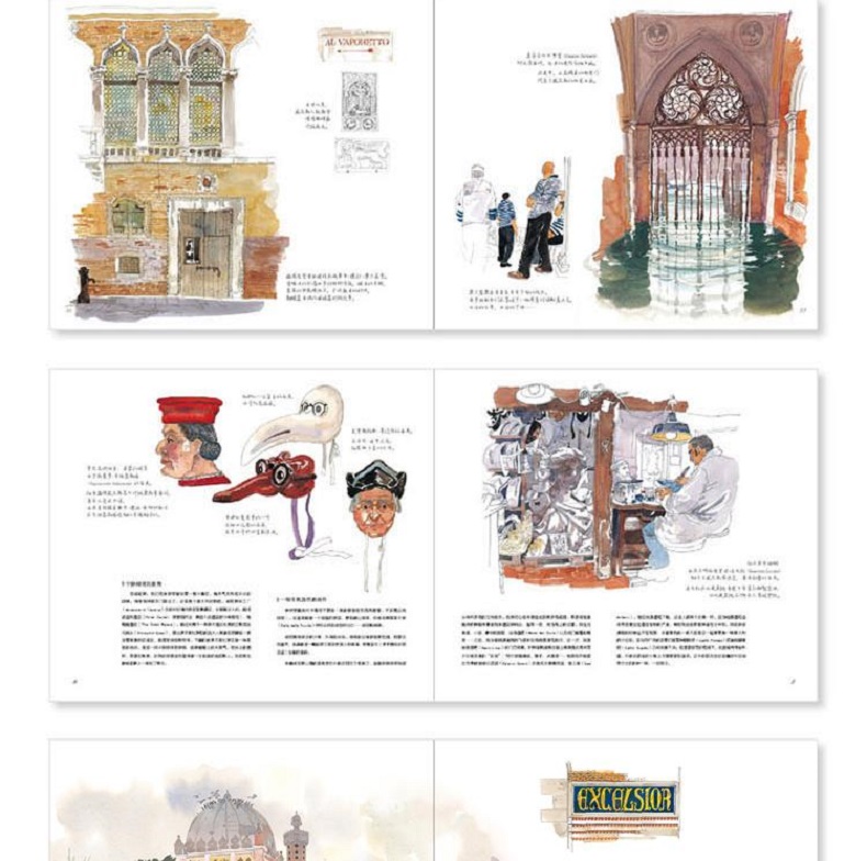 在《威尼斯水彩筆記》中,法國著名水彩畫家法布里斯·穆瓦羅用120餘幅精彩的作品描繪了威尼斯典雅浪漫的城市風貌,展現了威尼斯兼容併包的美。