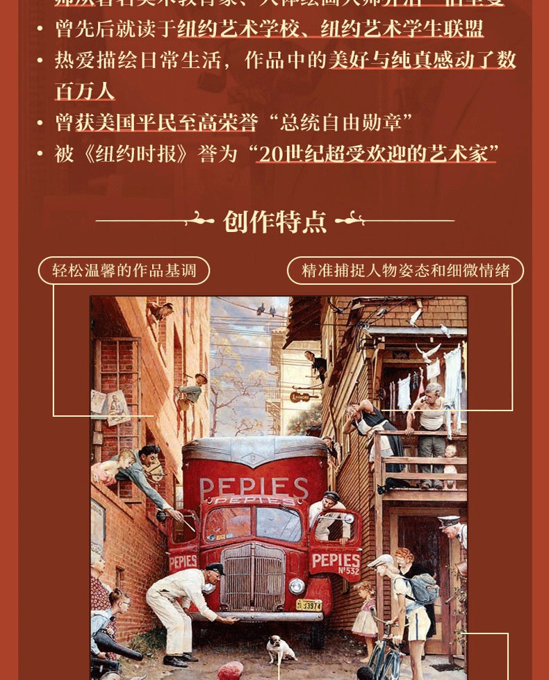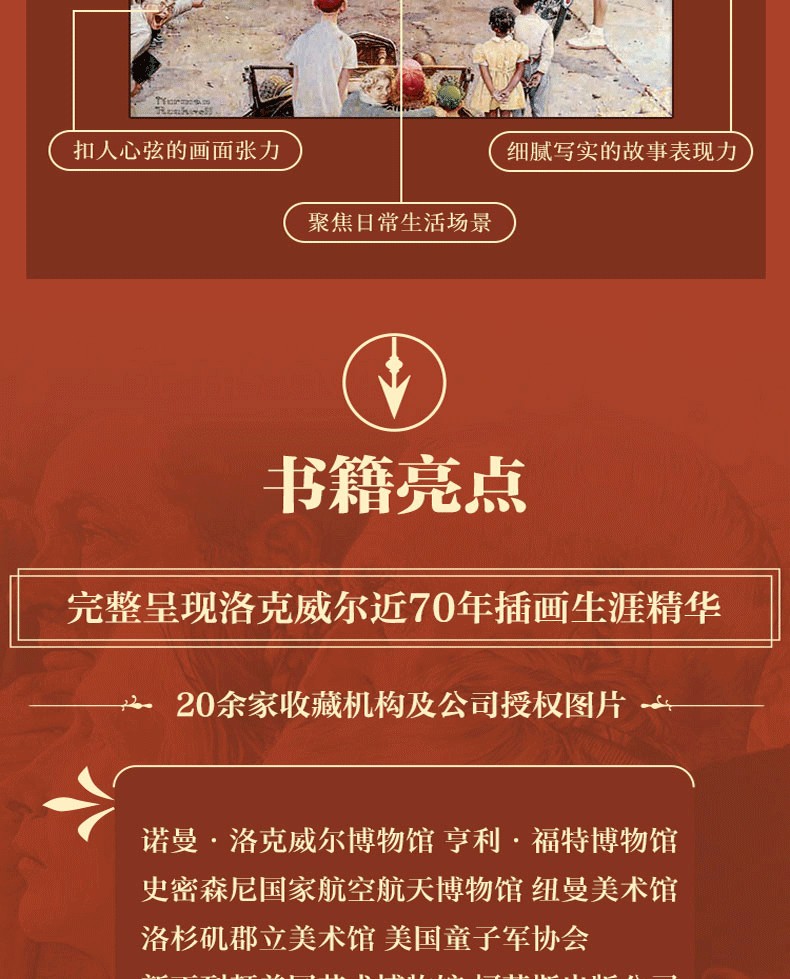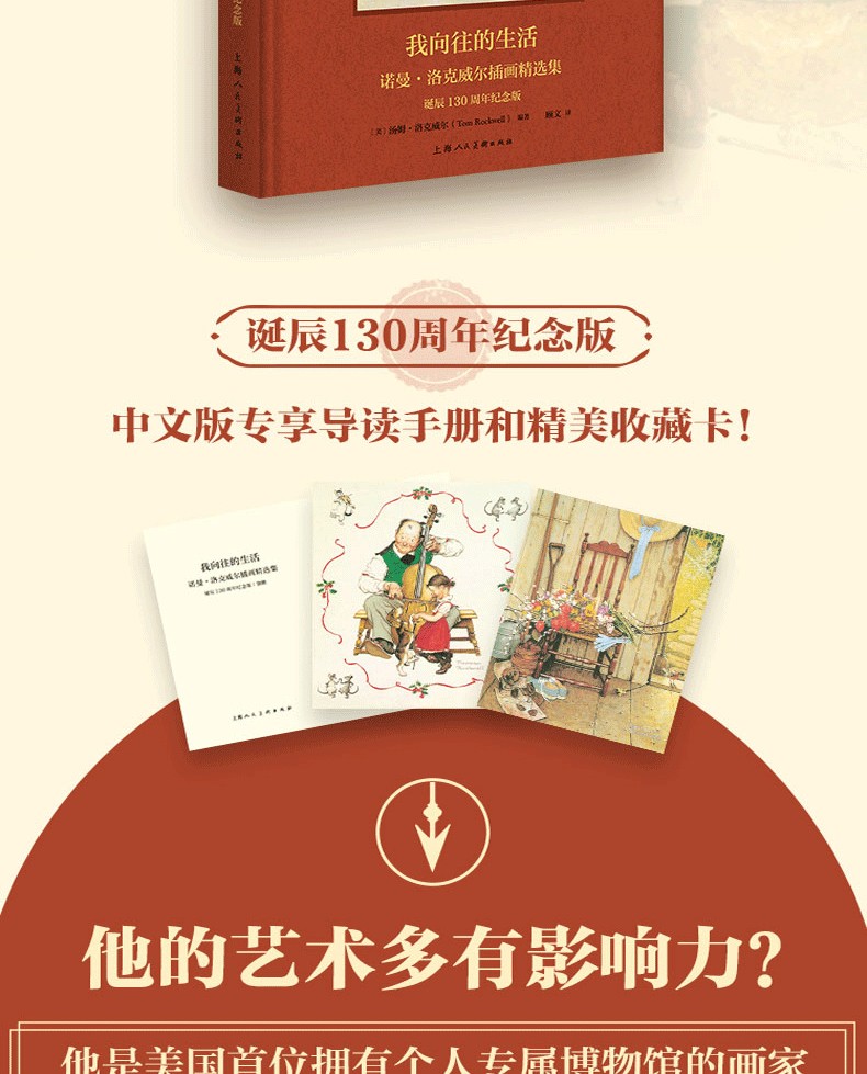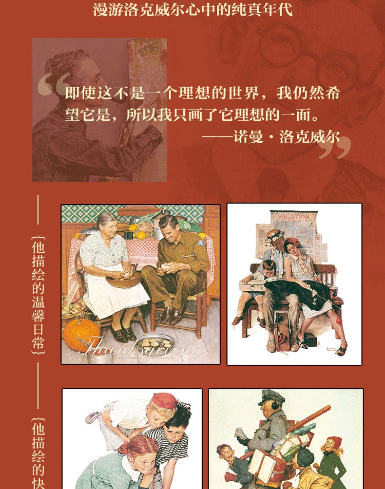 洛克威爾是一位高產的藝術家,一生創作了4000餘幅優秀畫作。洛克威爾始終堅持“按照自己喜歡的方式描繪生活”,他通過畫作歌頌普通人的日常生活,作品中獨特的美好與純真感動了數百萬人。這本插畫集是洛克威爾的兒子湯姆精選出其150幅最為精美的畫作彙集而成的,包括100幅經典代表作和50幅此前從未面世的珍貴手稿。翻開畫集,我們彷彿身臨洛克威爾所處的時代,一幅幅鮮活的生活圖景在我們面前徐徐展開。這些作品中細膩寫實的故事表現力和扣人心弦的畫面張力,充分展現了洛克威爾的精湛畫技和匠心巧思,也奠定了其家喻戶曉的美國國民插畫家地位。