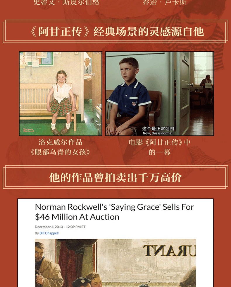 諾曼·洛克威爾(1894—1978),美國傳奇插畫大師,師從·伯里曼,因生動描繪國家風土人物獲美國平民最高榮譽“總統自由勛章”,被《紐約時報》譽為“20世紀美國最受歡迎的藝術家”。洛克威爾也深受邁克爾·傑克遜、史蒂文·斯皮爾伯格、喬治·盧卡斯等藝術家喜愛,對他們的藝術創作產生了深遠影響。
