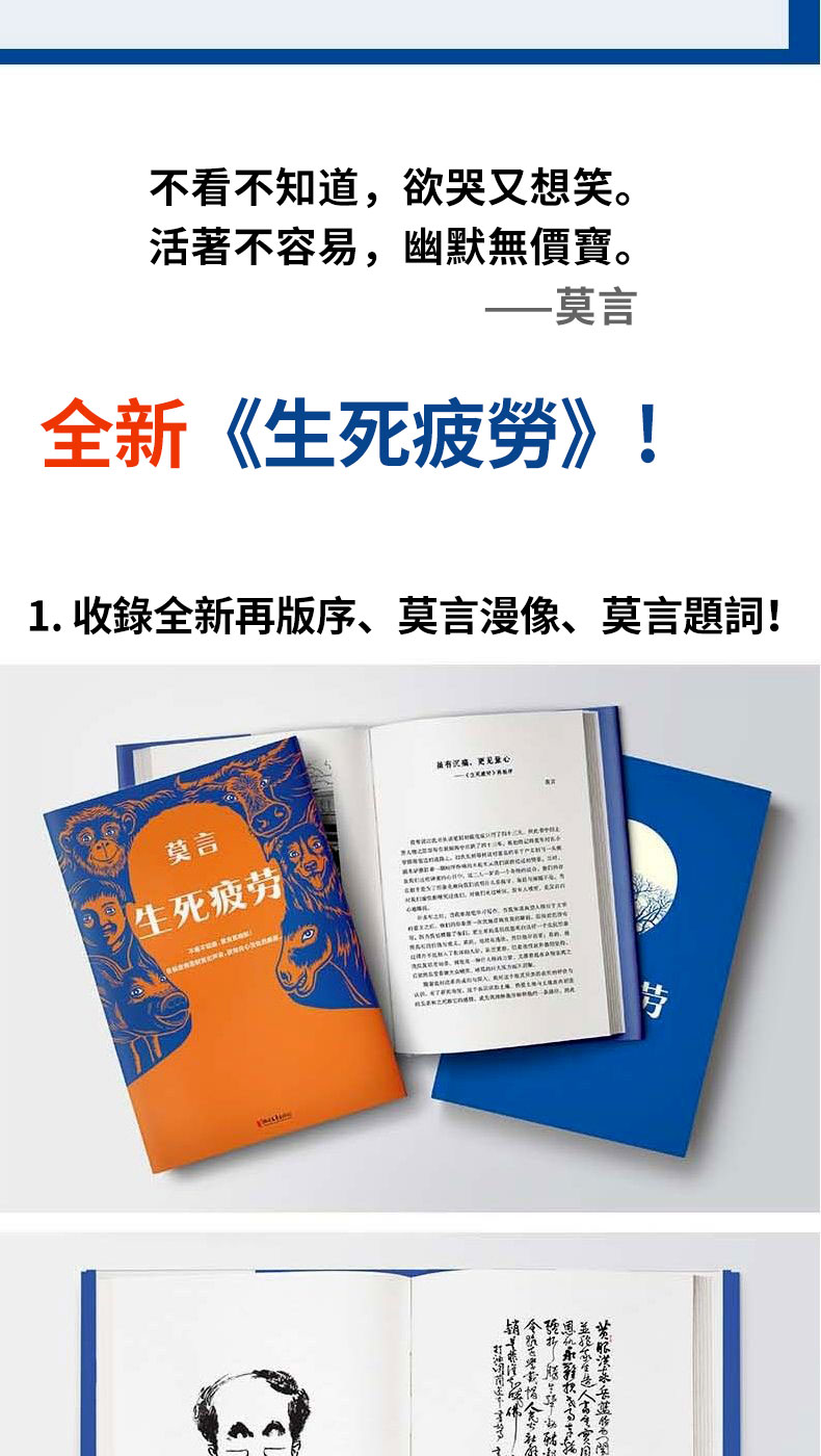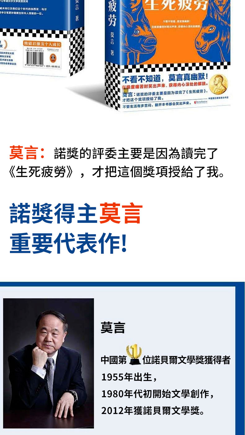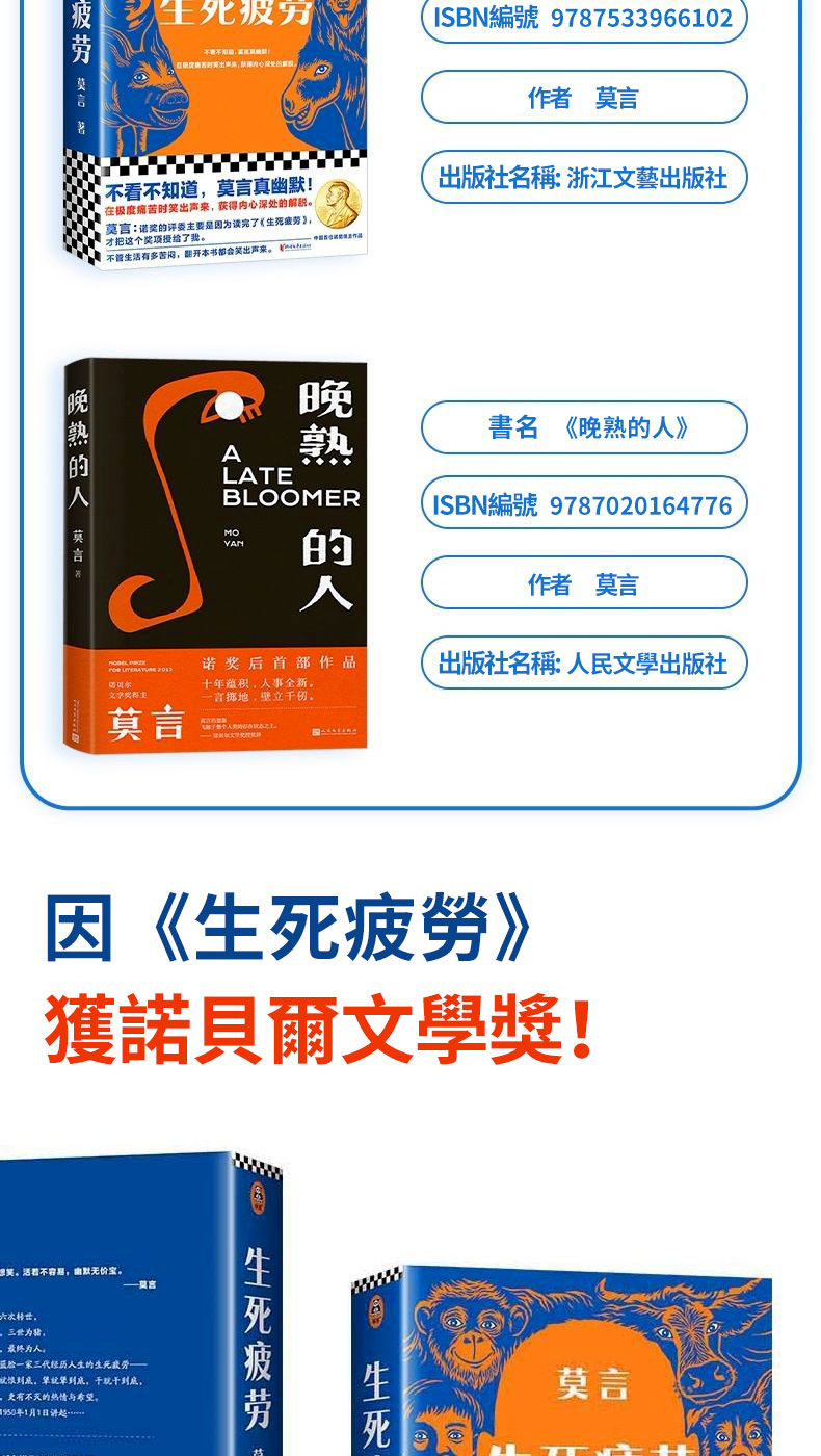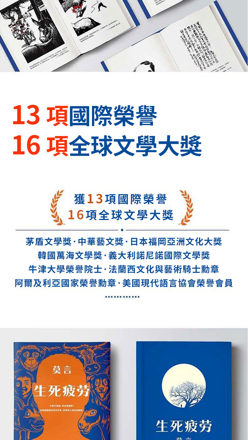 【全台免運 】中國首位諾貝爾文學獎莫言代表作《生死疲勞》+《晚熟的人》精裝紀念版共冊本,飽含著對人的命運的深深關懷和憐憫,用幽默語言寫盡人生百態