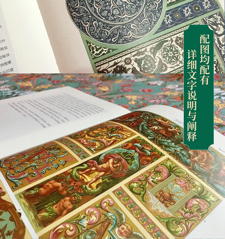 庭藝術”“西方藝術”,精美復原拉西內原作的全部220幅手繪彩色圖版及160餘幅古籍插圖資料,涵蓋4000餘種裝飾紋樣圖案,每幅圖版均配有詳細解說,全