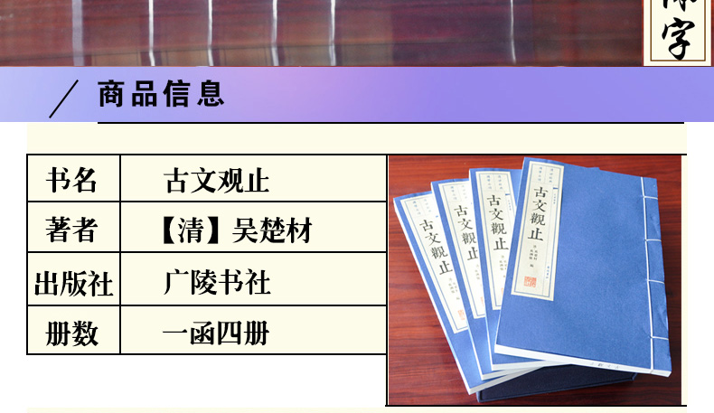 《古文觀止》是歷代散文總集。清代吳楚材、吳調侯編選,吳興祚審定。 《古文觀止(上下)》收錄了古代上起東週下至明末的散文222篇,雖比較一些選本所選篇目不算多,但它能重其所重,輕其所輕,故《古文觀止》問世至今300年來風行不衰,是清代以來流傳廣泛影響大的散文選本。 「觀止」二字出左傳,意思是:讀了這些盡美盡善的文章,別的文章就用不著去讀了。