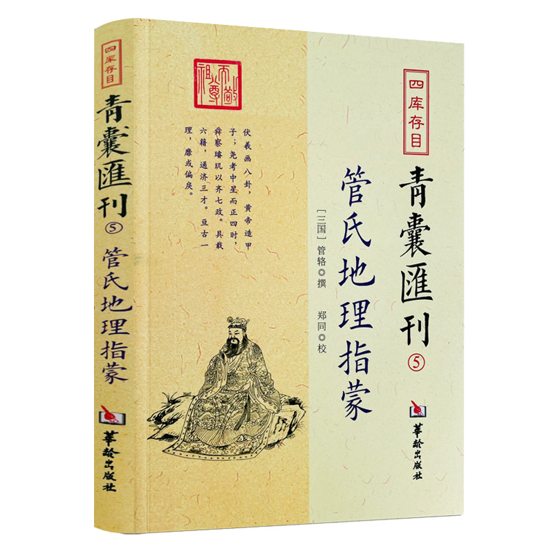 青囊即古代學者隨身攜帶實用典籍的袋子,後被用指中國古代子部典籍的別稱。管輅撰的《四庫存目青囊匯刊(5管氏地理指蒙)》據《四庫存目提要》,一一收集館藏或私藏原本,以中國古代哲學思想為指導,輯錄出典籍的子部相關著作,簡體橫排,參閱諸本,點校整理,以便於當今學者對中國古代哲學的研究。是書規模宏大,徵引豐富;圖文並茂,收錄廣泛;結構嚴謹,體例完備;分類詳細,便於檢索。是研究中國古代哲學思想的重要文獻資料。