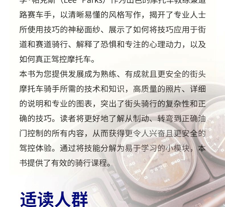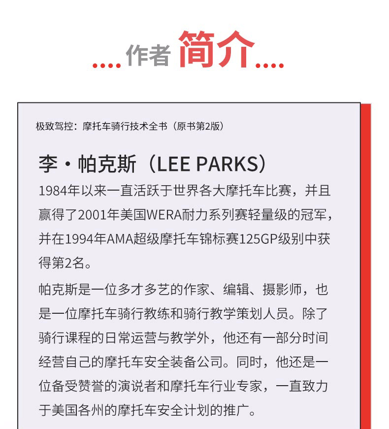 李·帕克斯(Lee Parks)作為出色的摩托車教練兼道路賽車手,以清晰易懂的風格寫作,揭開了專業人士所使用技巧的神秘面紗、展示瞭如何將技巧應用於街道和賽道騎行、解釋了恐懼和專注的心理動力,以及如何真正駕控摩托車。