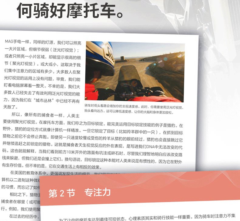 ■ 從駕駛裝備到騎行方式的基礎理論開始講起,深入淺出的同時專業性較強,受眾群體廣泛。