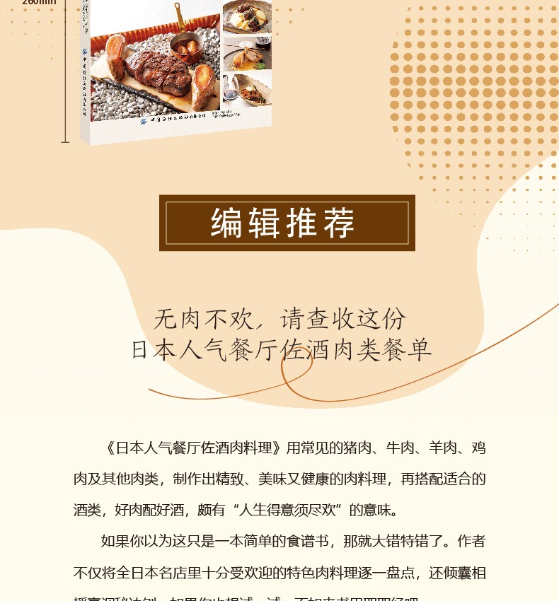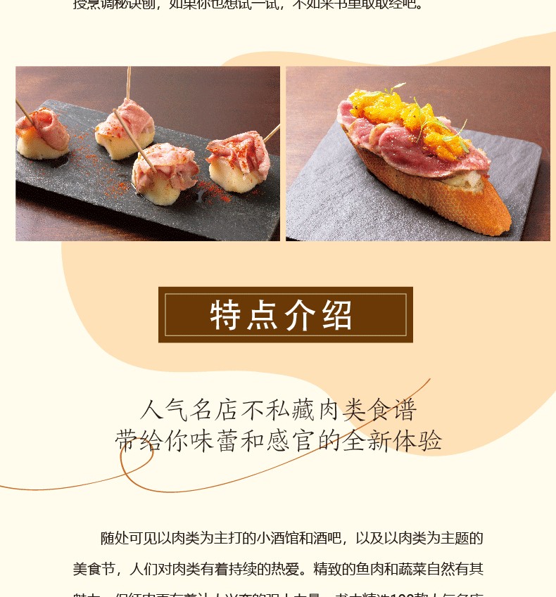 《日本人氣餐廳佐酒肉料理》介紹了100種富有創意的專業肉類的烹飪方法,按照牛肉、豬肉、羊肉、禽肉和其他肉類進行編排和分類,附有詳細的製作過程圖和專業的講解及演示。