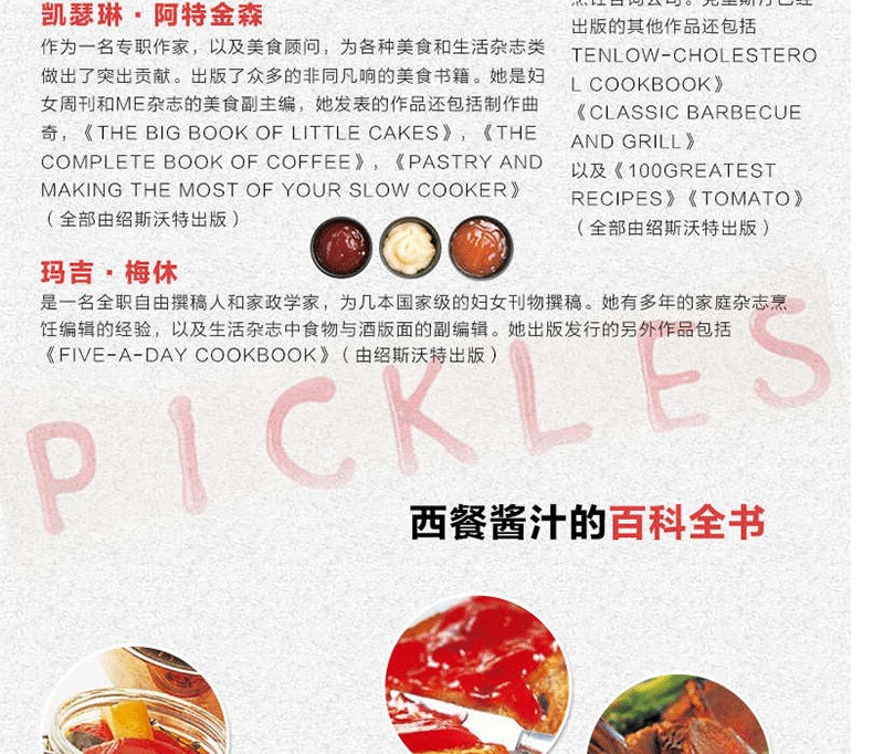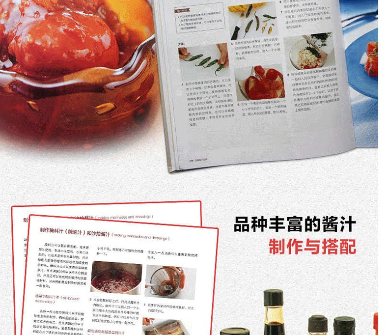 這些食譜包括有適合於任何場合併且非常適用的各種口味。肉醬、塔塔少司,以及辣莎莎醬等,可以裝瓶的華麗的用青檸檬細外皮絲製成的柑橘類果醬,以及用杏仁酒浸泡的杏等,如此,你可以將從超市內購買的成品的醬汁和果醬蜜餞等等束之高閣了。