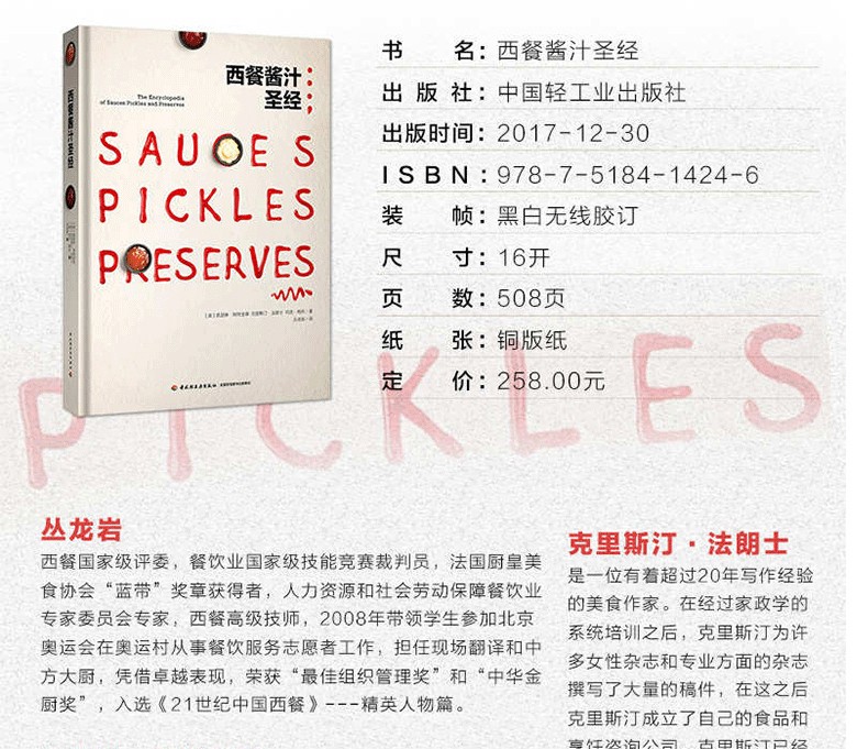 《西餐醬汁聖經》伴隨著這本包含有醬汁、莎莎醬、開胃小菜、酸辣醬、泡菜、蘸醬、芥末醬、柑橘類果醬、果膠和果醬等的實用性製作手冊,讓你精心製作的每一餐都令人難以忘懷。超過400道的這些配餐類的美食會給你製作的每一道菜餚增添一種原汁原味的風範,無論是搭配意大利面的傳統番茄醬汁,搭配鴨肉的香味撲鼻的橙味醬汁,還是隨手製作的用來搭配什錦蔬菜絲的沙爹串,也或者是當作配菜伴食的一道涼的沙拉。
