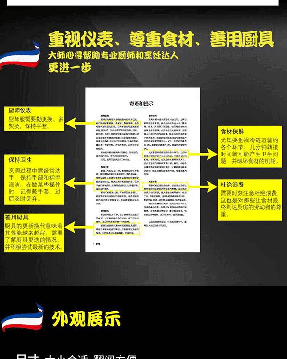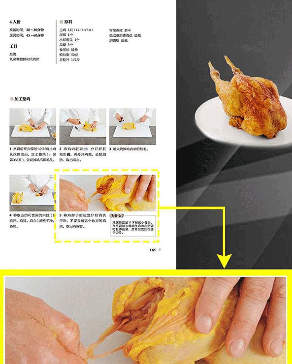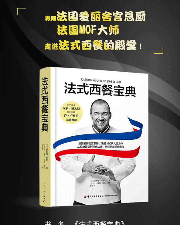 《法式西餐寶典》為法國愛麗舍宮總廚、法國最佳工匠(MOF)之一紀堯姆·戈麥關於法式西餐烹飪的經典之作。作者78道食譜,從法國總統府國宴菜到經典的法式西餐,涵蓋開胃菜、海鮮、家禽、肉類、蔬菜、醬汁、甜點、配菜等,還包括食材處理、高湯製作、餐巾折疊等烹飪基礎知識。每一步操作都配有清晰的步驟圖解,關鍵步驟還有主廚詳盡的提示。本書能夠為專業人士及美食愛好者學習法式西餐烹飪提供專業且詳盡的指導。
