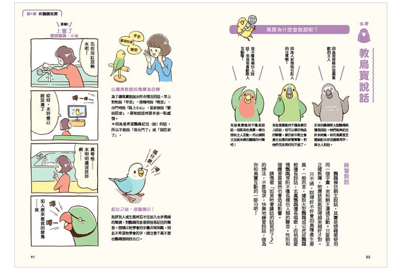 日常照料:每天的飲食、打掃鳥籠、幫鳥寶洗澡或日光浴的方法、修整趾甲等。