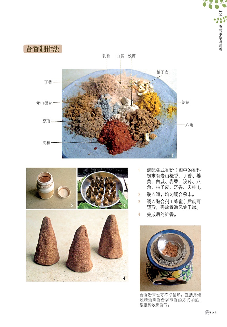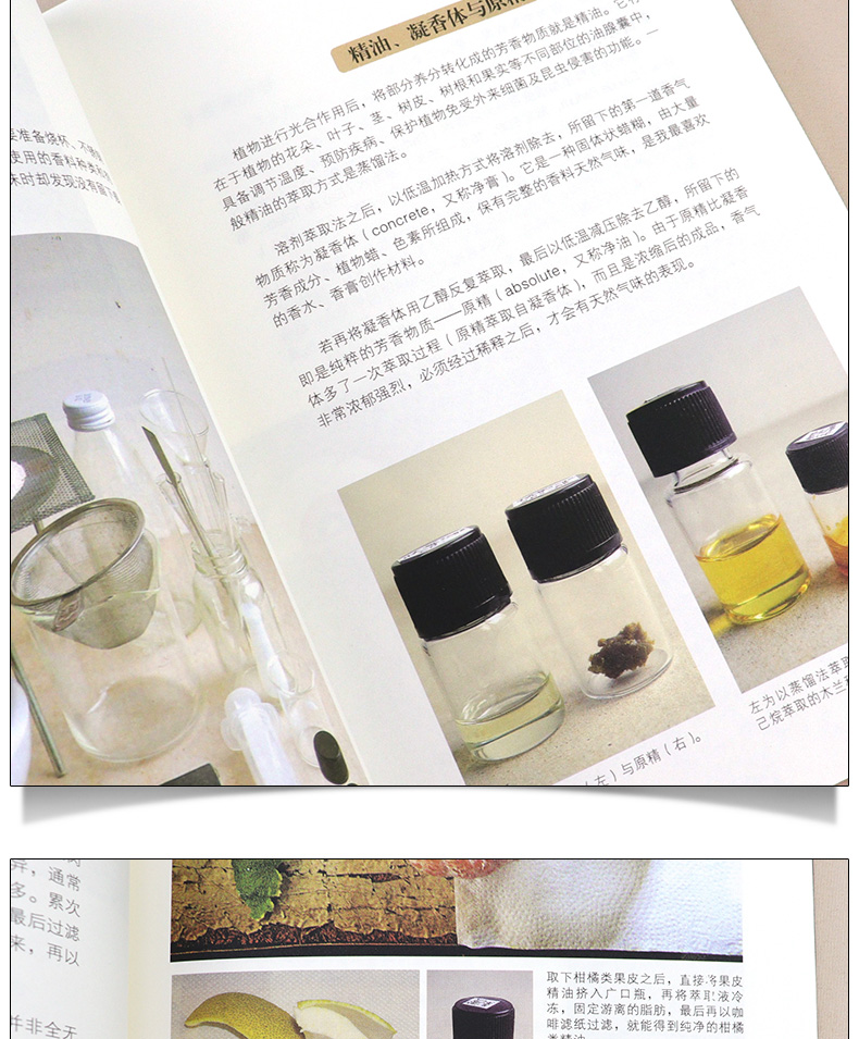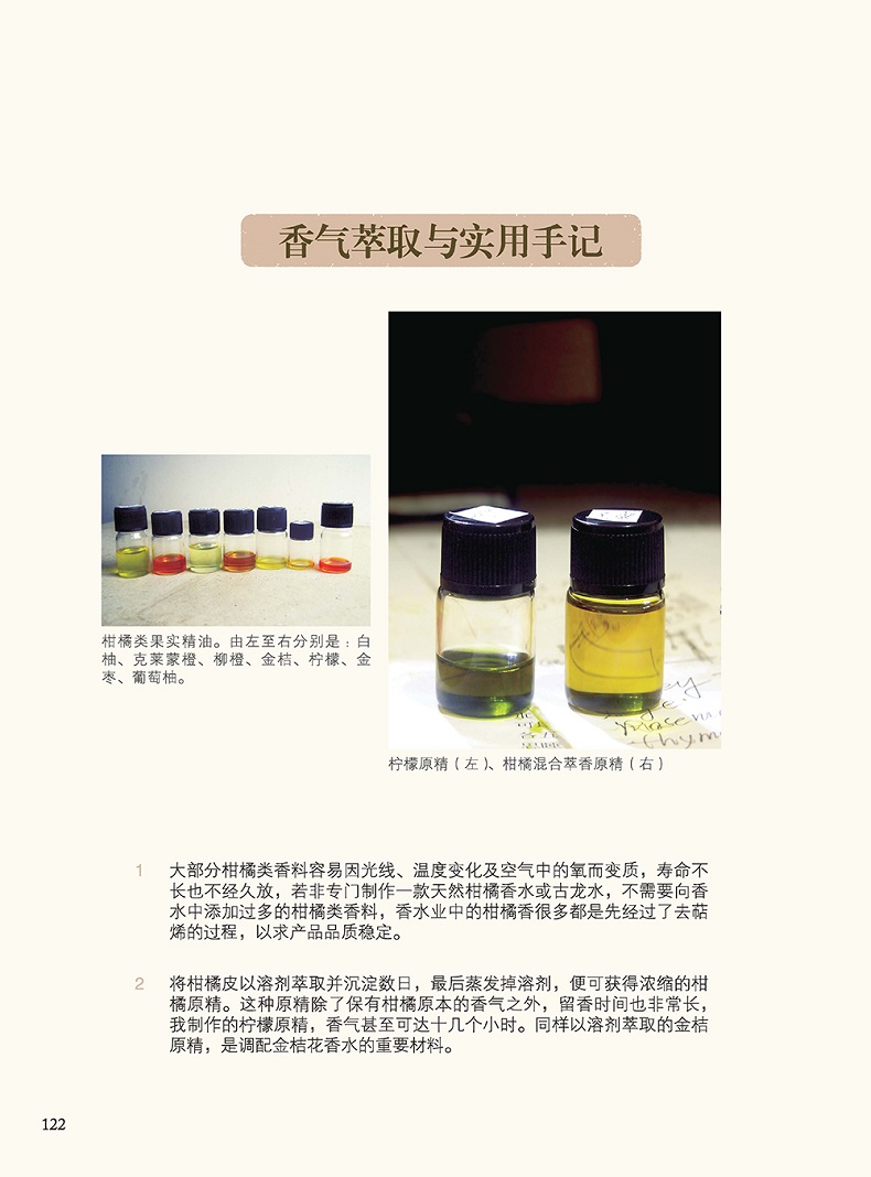 《調香手記:55種天然香料萃取實錄》圖解四種香料萃取方法(合香、浸泡、擠壓、脂吸),從五大類(花朵、果實、草葉、芳香中草藥、動物性香料)入手,細說55種天然香料的色與萃取過程,提供調香建議與技巧,無需昂貴設備就能提取原精,調配香水。