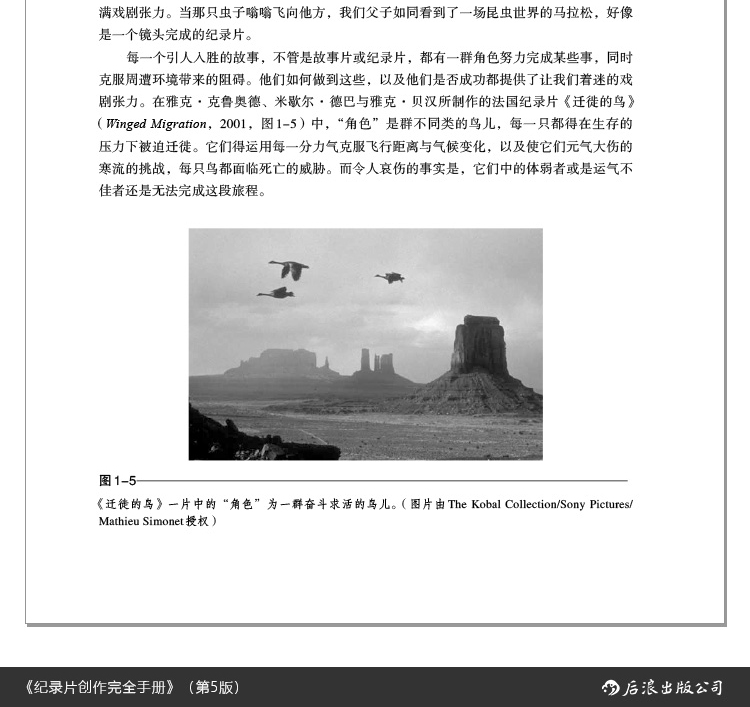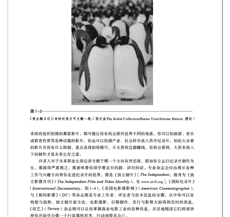 1.2? 如何維生 現在製作紀錄片的費用並不昂貴,也有許多類的紀錄片能讓作者賺點小錢,但通常要過個中產階級的生活還不夠。導演們常常得去教個課、拍個簡介片什麼的才能勉強過日子,能賺大錢以及帶來光環的是能搬上大銀幕的獨立製作院線紀錄片。法國導演呂克?雅蓋(Luc?Jacquet)的《帝企鵝日記》(March of the Penguins,2005,圖1-3)在上映之後頭20週就賺進7700萬美元;邁克爾?摩爾的《華氏911》(Fahrenheit 911,2004)的票房總收入達1.19億美元。迪士尼公司已經成立的一家新的子公司迪士尼自然(Disneynature),將以每四年為一個週期製作與發行紀錄片。年輕的影片作者入行可以拿一些像是醫療、訓練、婚禮、生日、網絡影片及本地活動等委託製作案來開始,另外像是新聞專題、實境節目以及為慈善機構或非政府組織拍攝的募款影片,都可能讓你有機會遊歷世界不同的角落。你可以拍旅遊、音樂或教育性質等各種議題的影片,你也可以拍攝產業、社會科學或人類學紀錄片,拍給大眾看的影片並沒有什麼限制,重點是得拍得精巧、不太貴而且能賺錢。你將會看到,大資本投入下的製作才是未來生存之道。