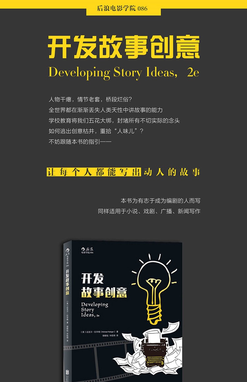 邁克爾·拉畢格所著的《開發故事創意》重點關 注影視項目的前期工作——故事創意,訓練編劇挖掘 藝術個性,切實有效地從自身經歷和體悟出發進行創 作。作者提出“CLOSAT”訓練法,根據不同的故事類 型細緻地幫助編劇建立創意開發體系,如取材童年故 事、家庭 故事、神話傳說與民間故事、夢、短篇小 說或新聞事件等,對創作紀錄片、故 事短片、劇情 長片等虛構與非虛構類作品同樣適用。書中設置了大 量習題、示例、創作討論並附有延展閱讀書單,可操 作性極強。無論編劇還是其他文創產業工作者,都能 從中獲得啟發。