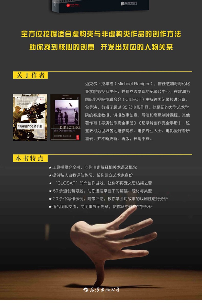 邁克爾·拉畢格(Michael Rabiger),曾任芝加哥哥倫比亞學院影視系主任,並建立了該學院的紀錄片中心,在歐洲為國際影視院校聯合會(CILECT)主持跨國紀錄片講習班,曾導演、剪輯了超過35部電影作品。他是紐約大學藝術學院的客座教授,講授故事創意、導演和高ji製片課程。其他著作有《開發故事創意》(Developing Story Ideas)、《紀錄片創作wan全手冊》(Directing the Documentary),這些教材為世界各地電影院校、電影專業人士、電影愛好者所喜愛,並不斷更新、再版,長銷不衰。