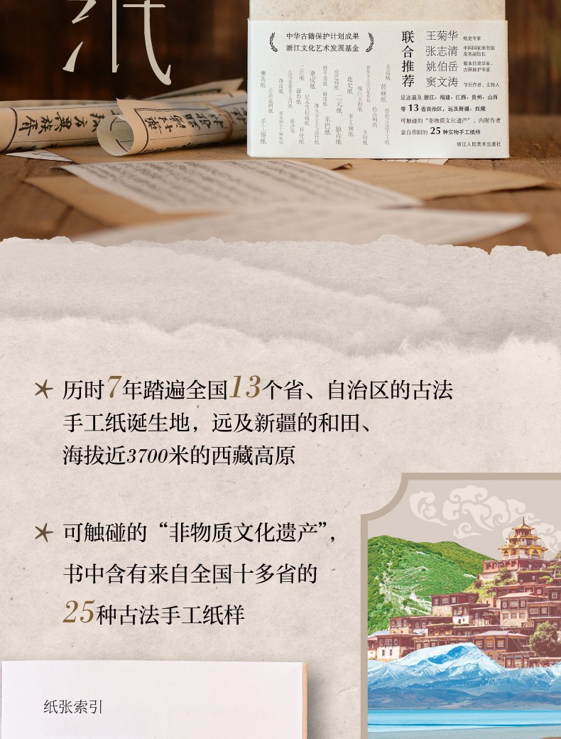 一名古籍修復師歷時七年,尋訪了中國13個省、自治區的全國古法手工造紙地。 她以親身經歷結合專業視角,考察了各地傳統手工造紙技藝及傳承現狀,記錄了「尋紙」過程中的點滴。 字裡行間流露出對探尋手工造紙術孜孜不倦的堅持,勾勒出一幅當代中國傳統手工紙製造業的現實畫卷。 冥冥之中的責任感、使命感不僅讓她與紙結緣,也驅使她開始現場考察古法手工紙誕生地的深入研究之旅。 本著對中國傳統手工造紙術的探尋之心,作者踏遍浙江、福建、山西、江西、貴州等十三個省自治區,遠及新疆的和田和海拔近3700公尺的西藏高原,親自帶回 書中所述的25種古法手工紙樣實物,將這項非物質文化遺產的現狀與傳承訓蓢道來。
