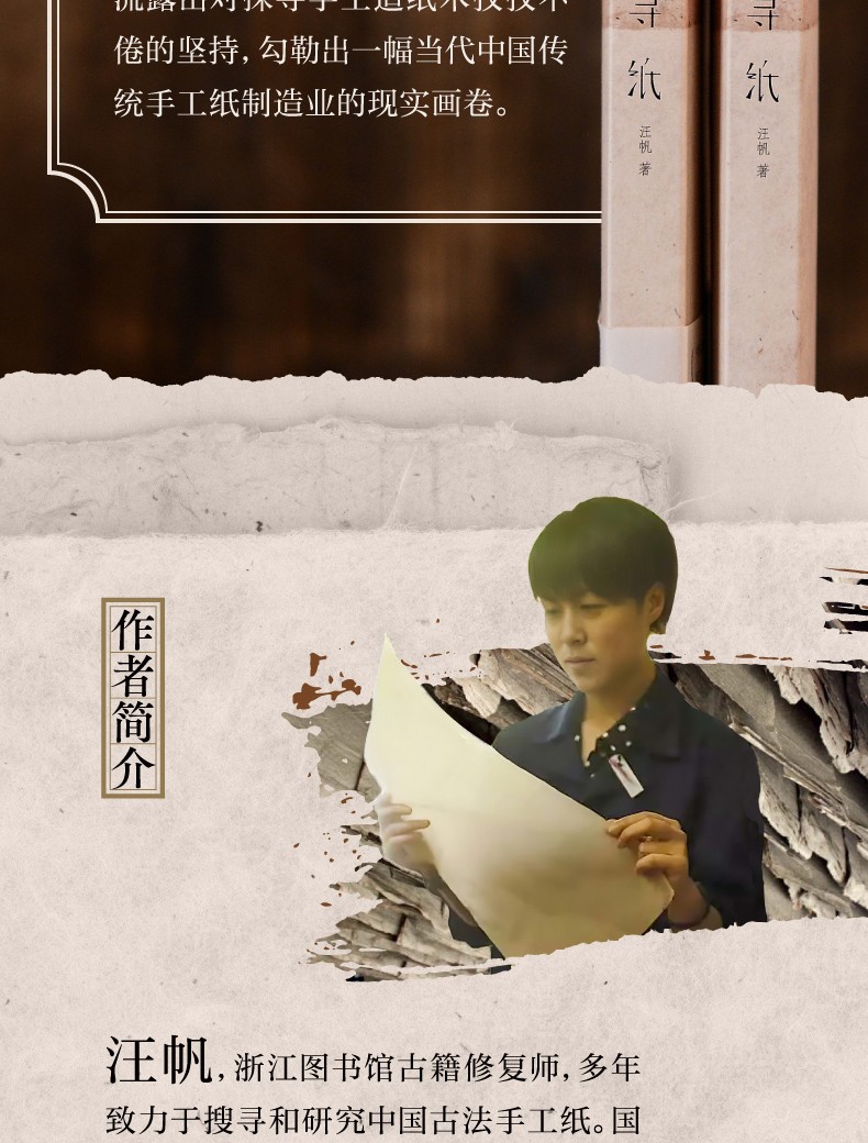 汪帆,1978年出生,2001年進入浙江圖書館古籍部工作,先後在閱覽組、縮微組任職,2007年進入修復組,擔任古籍修復師。 在《藏書報》設有個人專欄,著有《書路修行》等古籍修復的主題作品。 在堅持古籍修復的專業工作之外,汪帆有意將今後的研究方向定在尋訪手工古法造紙上,通過野外考察、踏勘手工紙製作現場,全面了解現狀,探索有利於手工修復紙傳承、發展 的途徑。
