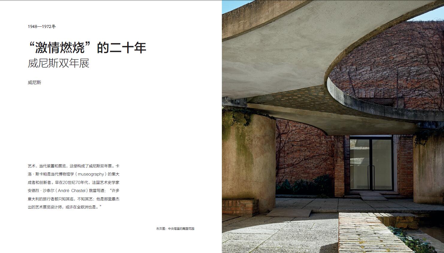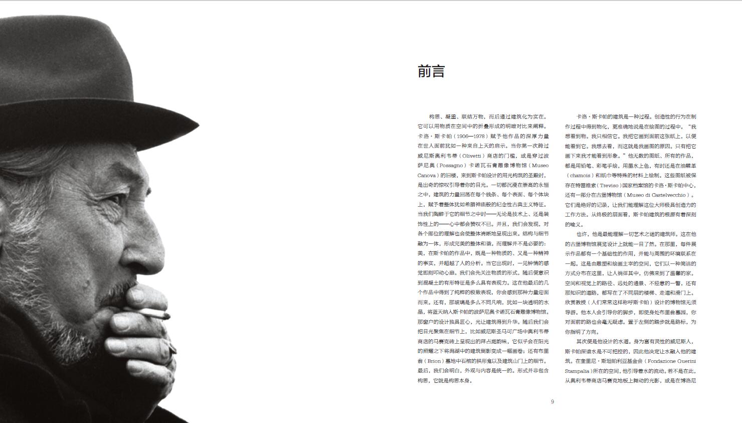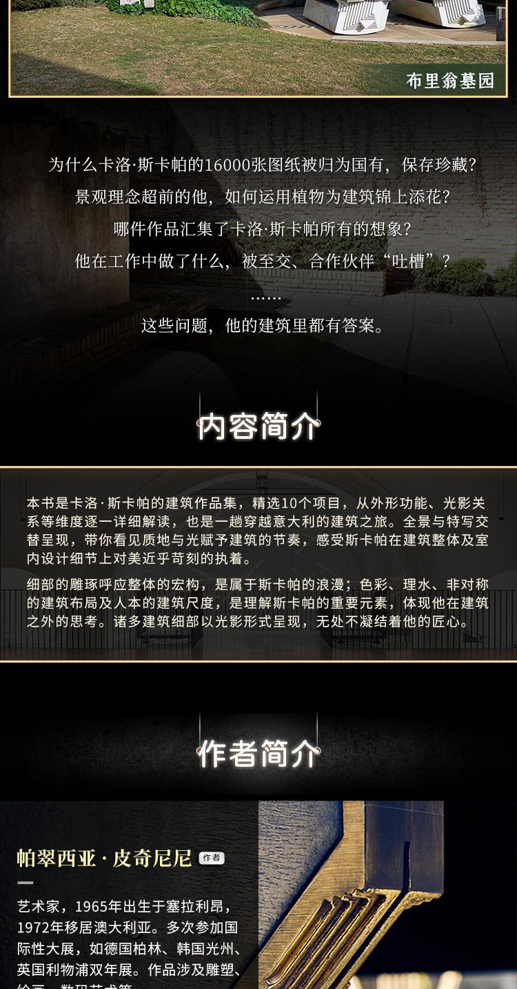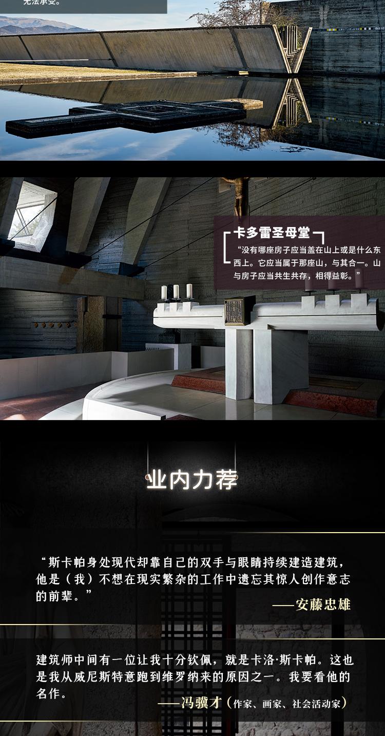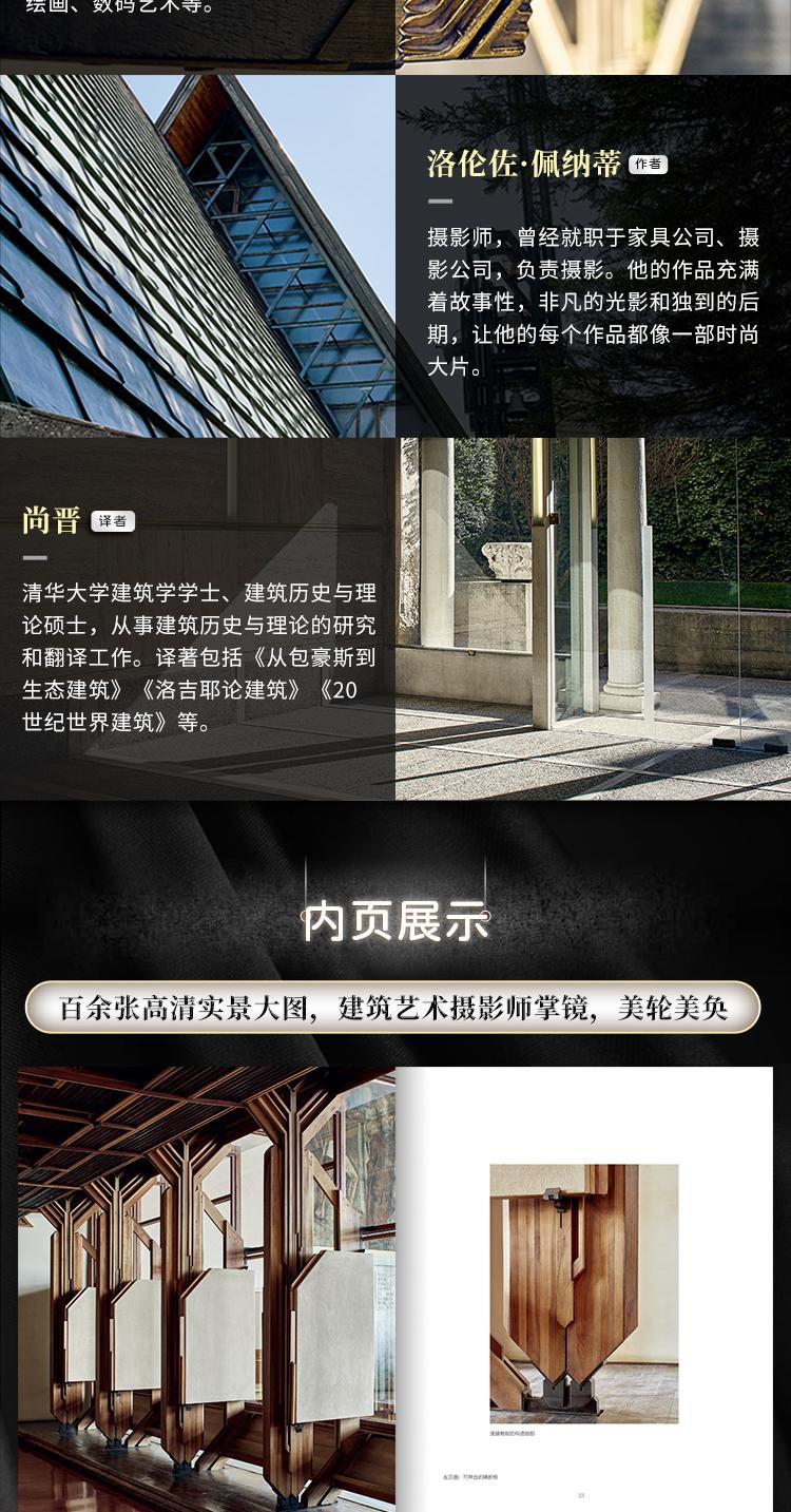 本書精選斯卡帕的十個建築項目,從建築的外形與功能、光影關係上對每個作品進行解讀,如同帶領讀者開啟了一場穿越威尼斯、維琴察、特雷維索、維羅納、博洛尼亞的美學之旅。藝術家皮奇尼尼拋開冰冷的建築圖紙和艱深的研究,將溫度融入建築之中,為建築解析帶來人文性的關懷視角。書中照片由攝影師洛倫佐·佩納蒂(Lorenzo Pennati)拍攝,建築在整體與特寫之間交替呈現。這些照片聚焦公共場所,如博物館、商店、辦公大樓,探索質地、光賦予建築的節奏,以及簡單的線條所表達的詩意,向讀者展示了斯卡帕在建築整體以及室內設計細節方面對美近乎苛刻的執著。作者同時講述了斯卡帕設計生命的延續——兒子托比亞在修復一新的聖母教堂中為父親的作品開闢的一處展館,並在本書末尾為斯卡帕做傳。
