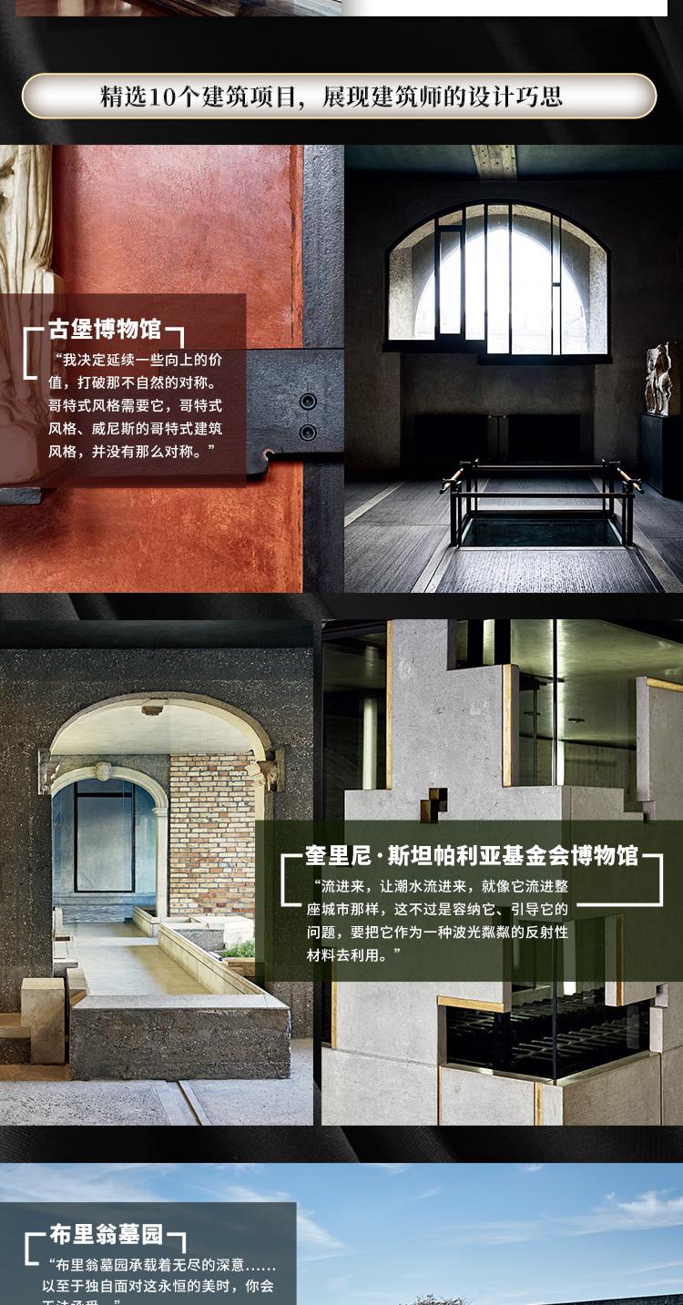 翻看本書,就像開啟了一場穿越意大利的建築之旅。從威尼斯、維琴察、特雷維索到維羅納、博洛尼亞。我們跟隨斯卡帕踏上這一趟美的旅程,有澳大利亞女藝術家帕翠西亞·皮奇尼尼一路為我們“導遊解說”,意大利攝影師洛倫佐·佩納蒂用鏡頭留下感動。我們看斯卡帕在古堡博物館打破不自然的對稱,在卡諾瓦石膏雕像博物館中用光昇華雕像,在卡多雷聖母堂中融合自然與人工,在布里翁墓地中用“雙環”聯結生命的盡頭......