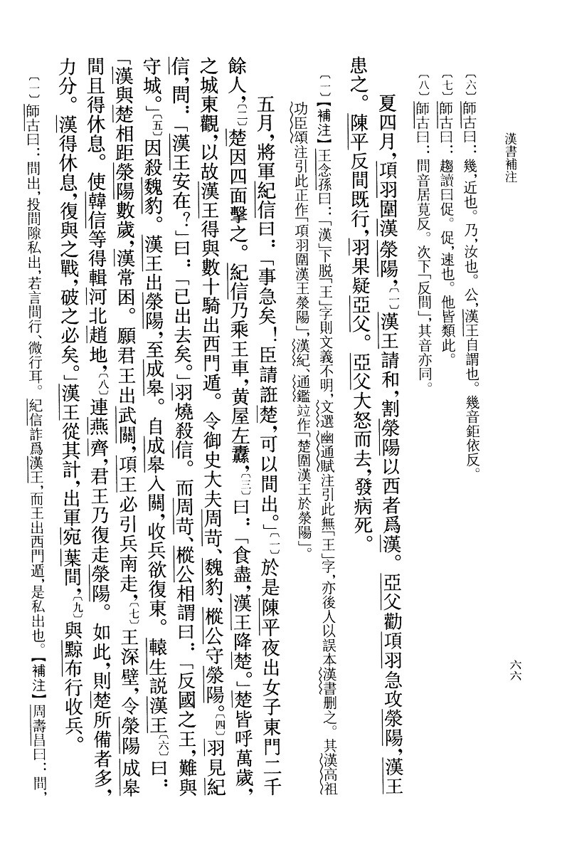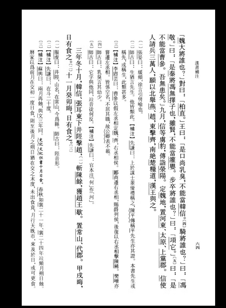 顏注問世以後,至宋,雕板興起,宋太宗淳化五年(九九四),命官分校三史,校畢,就杭州鏤板,是為淳化本,此漢書有板本之始。此後官府多次選官校勘,遂有景德監本、景佑刊誤本、熙寧本、宣和園子監本、幹道本等。其間對後世漢書流傳影響較大的,有餘靖的景格刊誤本、宋祁在其基礎上又增十五家而成的宋祁校本。同時民間摹刻以市易者滋多,南宋寧宗慶元年間(一一九五-一二〇〇),建安人劉之問取宋祁校本,別用十四家本參校,採人蕭該音義、司馬貞索隱刊、三家本刊誤等,印成劉建安刊。明代的官私刻本疊出,官本如取建安本而刊落甚多注文的南監本,私家本有毛氏用建安本但刪除了三劉刊誤、景佑刊語而成的汲古閣本,此外還有汪本、閩本、德薩本等。人清,漢書註本主要沿著兩條系統流傳,一是乾隆四年,取南監本別加考證而成的武英殿本,即補注中的官本,一是同治年間,金陵書局重印汲古閣本而成的金陵書局本。以上便是漢書補注出現前,漢書註釋、校勘、版本流傳的大致綫索。