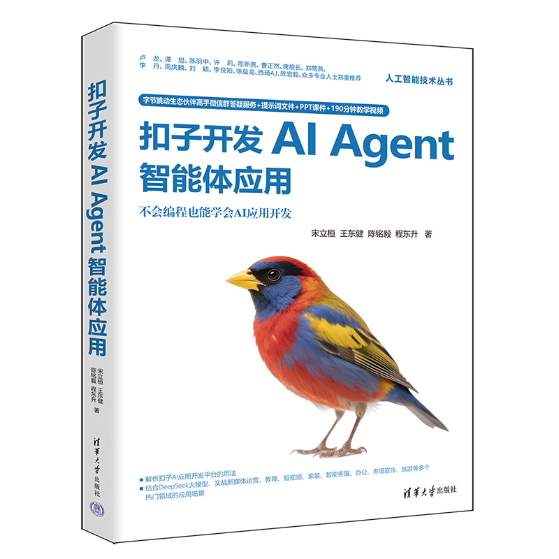 智能體(Agent)是大模型落地應用的重要方向,也是AI應用的一個重要風口。為了讓更多非技術出身的讀者能夠理解Agent,能夠零基礎開發AI應用,我們選擇火山引擎的釦子智能體開發平臺來設計開發自己的Agent。 《釦子開發AI Agent智能體應用》配套提示詞文件、PPT課件、190分鐘教學視頻、全書配圖PDF文件、字節跳動生態夥伴高手微信群答疑服務。 《釦子開發AI Agent智能體應用》共分16章,內容包括智能體概述、釦子AI應用開發平臺介紹、釦子插件和卡片、釦子工作流程詳解、基於大模型的企業知識庫、提示詞編寫和優化、釦子數據庫實戰、圖文混合的爆火推文生成器、看圖學營銷助手、智能設備營銷商、自動寫手法和智能工具、自動寫手與智能工具、自動寫手法、智能手組PPT的智慧辦公助理、新聞影片自動產生器和多Agent模式開發旅遊助理等。 《釦子開發AI Agent智能體應用》適合所有想要快速學習使用釦子開發智能體,以及對AIGC感興趣的讀者,也適合高等院校或高職高專院校學習智能體課程的學生。